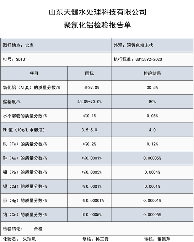 2、生产用按聚氯化铝固体:清水=1:9到1:15重量比(液体产品采用1:2到1:5)混合溶解即可。氧化铝含量低于1%的溶液易水解,会降低使用效果,浓度太高不易投加均匀。